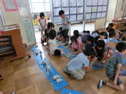 作りおわったどうぶつをねん土ばんごとならべて、「2の3 どうぶつえん」を作りました。みんなしゃがんでねん土のどうぶつたちを見ながら、「すごい」「上手」とほめ合って、どうぶつえんを楽しんでいました。