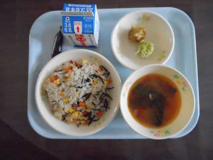 今日の献立は「コーンとひじきのごはん、さくらえびいりシュウマイ、ミネストローネスープ、ぎゅうにゅう、ミルメーク」です。