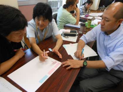 公開授業をもとに、グループに分かれて研究協議を行いました。「子どもたちにとっての必然性」のための手立てについて、良かった点や改善点を出し合いました。