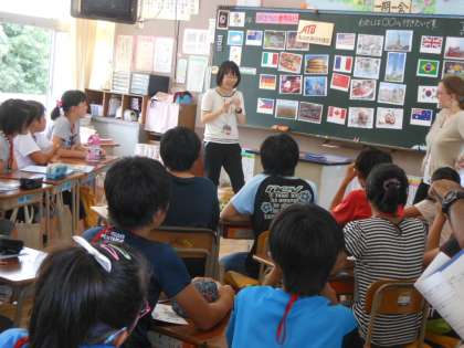 運動会・組み体操で世界遺産をテーマに表現したことと関連づけて、『愛鷹旅行代理店』を設定し、「外国に行きたい」「その国で、何を見たい。何を食べたい。」等の思いを英語で伝える活動を行いました。