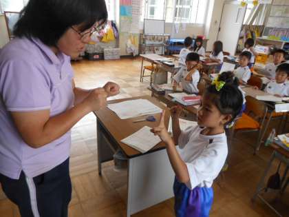 指を使って、足し算の答えをチェックしています。