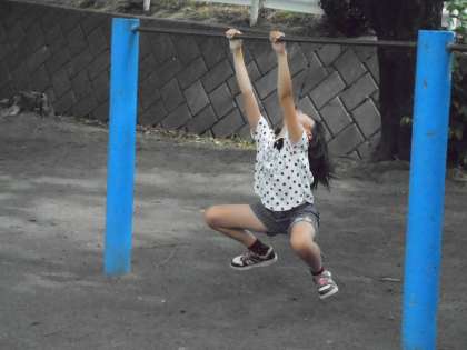 膝を曲げてぶら下がって何秒いけるかなど、楽しみながら力がついていくことをめざしています。