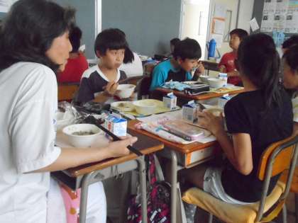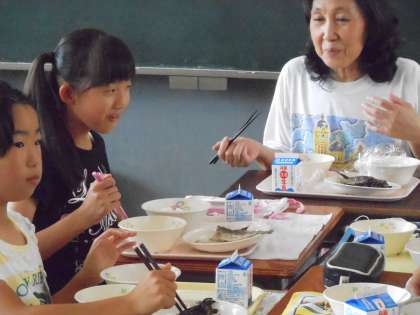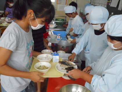今日のクラス訪問は調理師が5年生の教室で子どもたちと一緒に食事をとりました。