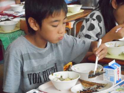 子どもたちは「あじのひもの」をおいしくいただきました。