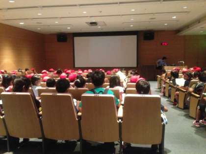 ただ今図書館でお話をきいています。みんなメモを一生懸命書いています。
