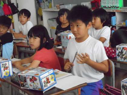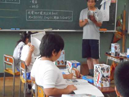 直列つなぎや並列つなぎの回路を学習きた子どもたちが、今度は乾電池を光電池に変えて、モーターを回したり豆電球を光らせたりしました。