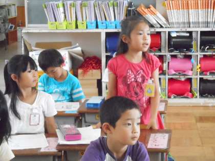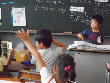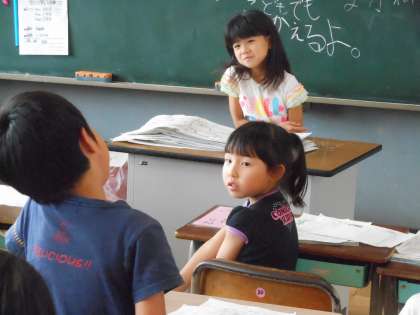 たんけんで見つけたひみつをクイズにして、楽しそうに問題を出したり、答えたりしています。