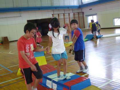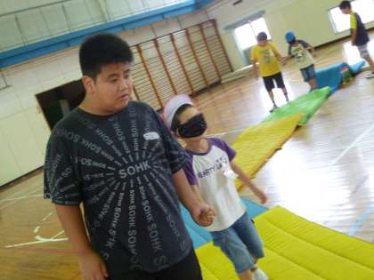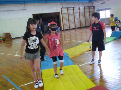 1年生が、福祉委員会が開いてくれたアイマスク体験に参加しました。少しの段差にどきっとしながらお兄さんたちに手をひいてもらって歩きました。