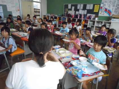 1年生の教室です。栄養士さんと一緒に、給食を食べました。