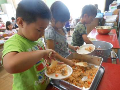 先生によそってもらっていたおかわりも、自分たちでよそっています。