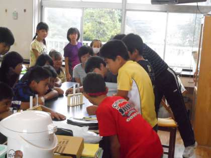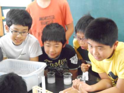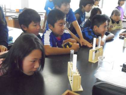 吸う空気とはいた空気の違いを、石灰水を使って確かめました。