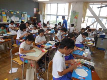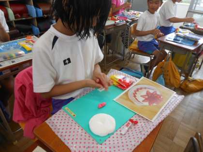 紙粘土で食べ物をそっくりに作る活動に入りました。実際に色をつけながら作製にあたってみると、最初の計画を変更した方がよさそうだったり…。しかし、自分で工夫することで、納得のいく作品になりそうです。