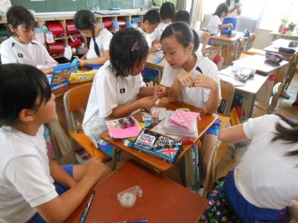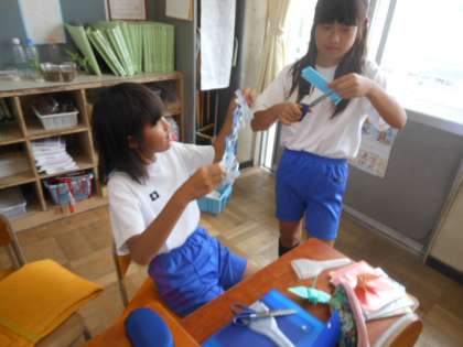 笹に飾る七夕飾りを作りました。友達同士で教え合ってすてきな飾りができました。短冊には一人一人の願い事を書きました。中央廊下掲示板に飾ってありますので、金曜日の参観のおりにぜひご覧ください。