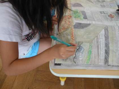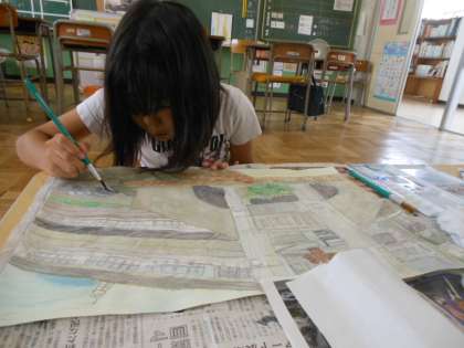 ようやく校舎の絵が完成しました。色ぬり講座で、下ぬりや色を重ねることを知り、味わいのある作品になりました。