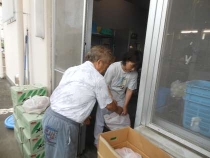 今日は1学期の給食最終日です。調理場では、朝届けられた野菜などを受け取り、調理開始の準備を進めていました。
