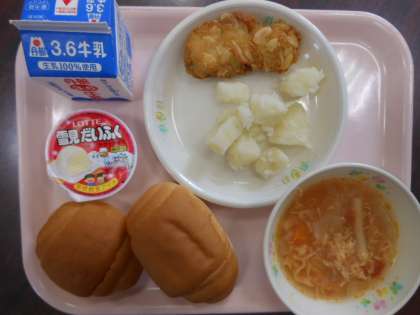 今日の献立は、「タラアーモンドフライ、こふきいも、ミネストローネスープ、パン、ぎゅうにゅう、ゆきみだいふく」です。