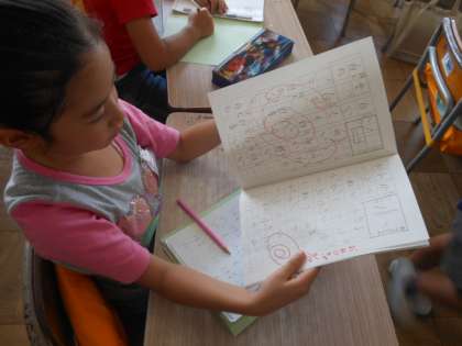 かんじれんしゅうをはじめたばかりですが、かたちをじょうずにつかんで、れんしゅうしています。