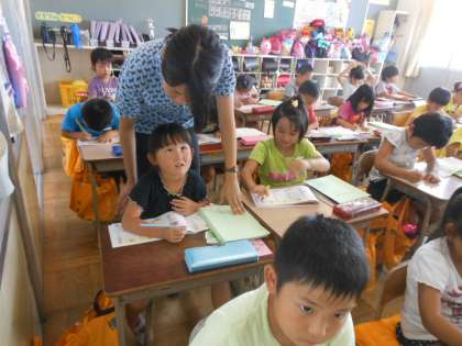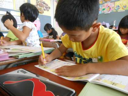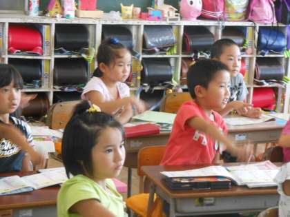 「休」の字を勉強しました。人が、木によりかかって休んでいる姿を思い浮かべながら、空に大きく指書きをして練習しました。