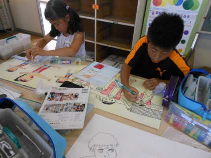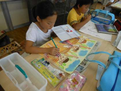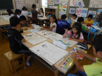 ソーラン節の絵を丁寧に描き進めています。輪郭線の中を「ぬる」のではなく、色で「描く」、色を「おく」ように、筆づかいを工夫しています。それぞれの思いを表現しています。