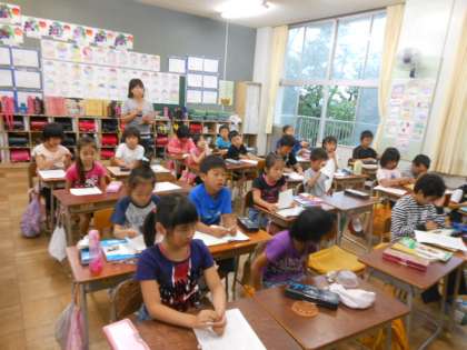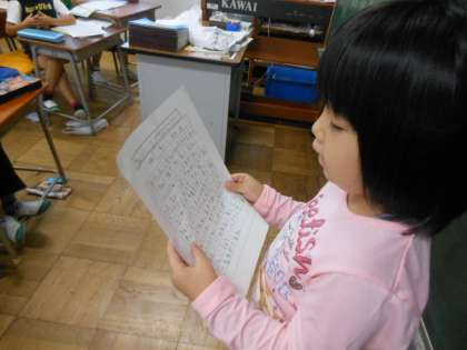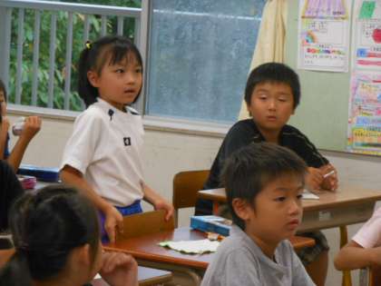 『スイカとメロンちがい』『リンゴとナシのちがい』など、2つのものの違いを、色・形・味などの観点で比べて書き、発表しました。