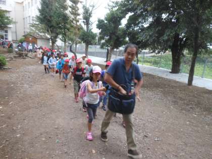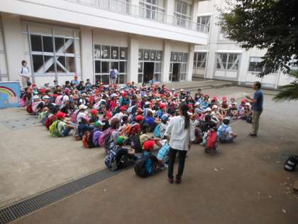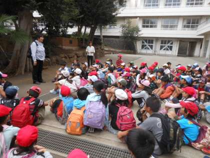 児童玄関前で出発式をして、片浜駅に向けて歩き出しました。