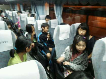 それぞれのバスの中で解散式が始まりました。一人一人が楽しかった思い出を発表しています。