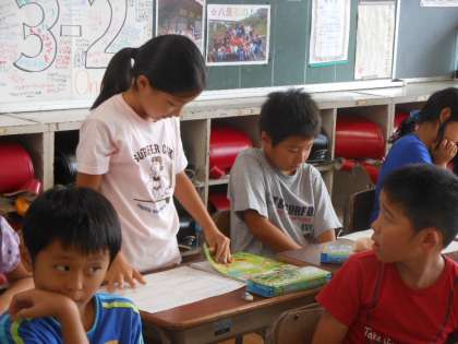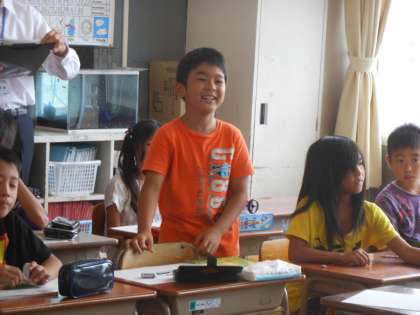 風とゴムの力で走る車を作り、今日は動力となる輪ゴムの引っ張る長さによって車がすすむ距離がどう変わるかという学習を行いました。予想を立てる段階では多くの予想が出されました。