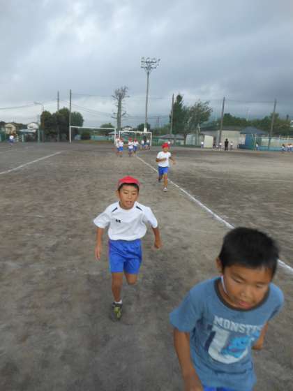 クラスでまとまっての準備運動の後、5分間の時間走が始まりました。