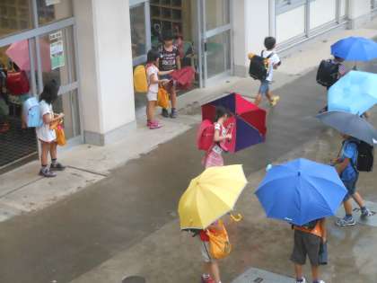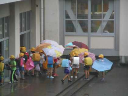ただ、1・2年生の下校時刻には小雨が降ってきました。子どもたちは色とりどりの傘をさして、校門を出て行きました。