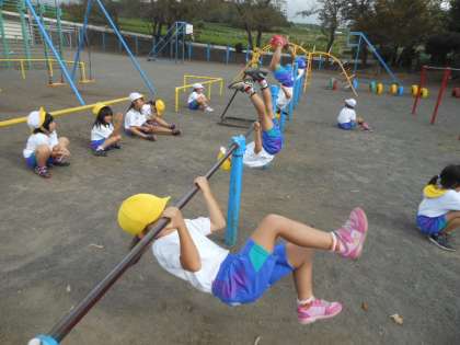 「うでをまげる!」「足を高くあげる!」と教わったコツをつぶやきながら練習をしました。できるようになった子には、みんなから拍手がおきました。