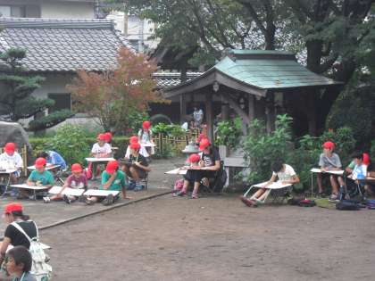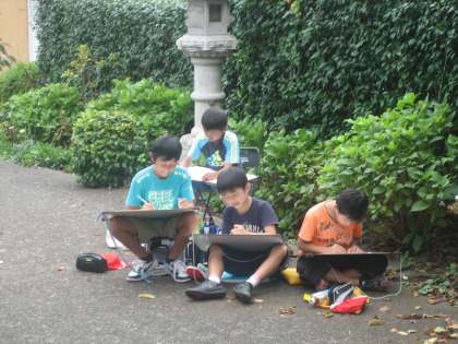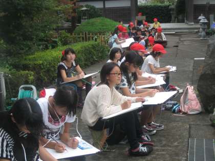 光厳寺さんへでかけ、写生会を行いました。複雑な組み立てによる建造物の形を正確にとらえるのに苦労をしながらも、気持ちのよい秋風の中、真剣に取り組む姿が見られました。