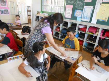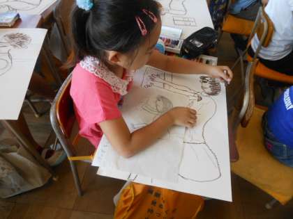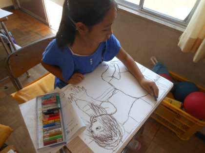 先週のデッサンを生かし、本番用の画用紙にクレヨンで下絵を描きました。