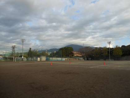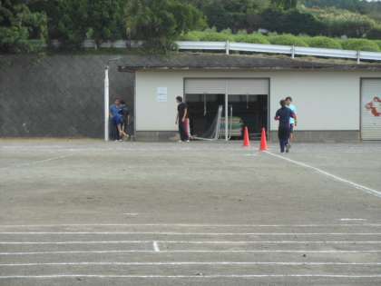 昨日の台風接近で消えてしまった運動場のラインを、先生方が早朝から引き直していました。