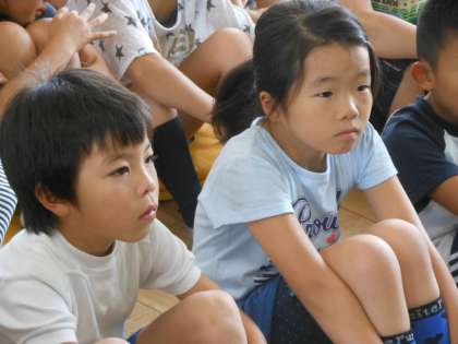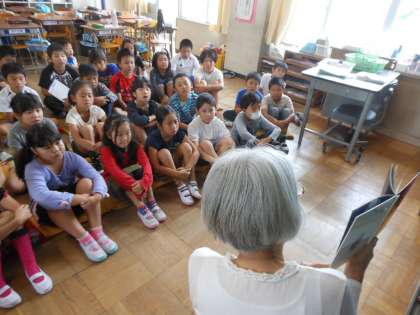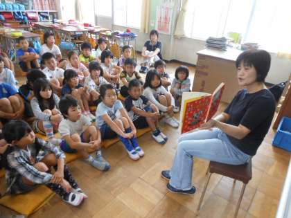 ボランティアさんの読み聞かせに、耳を傾けて聞き入っています。