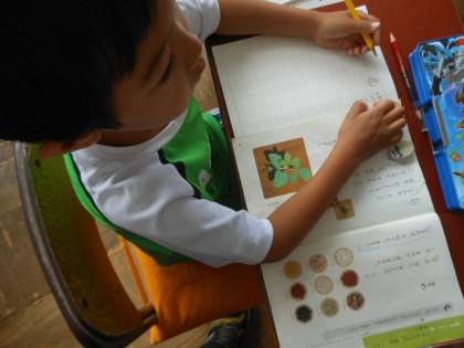 「まめのそだつようすが、アサガオににているね。」と言いながら、せつめい文を読み取りました。