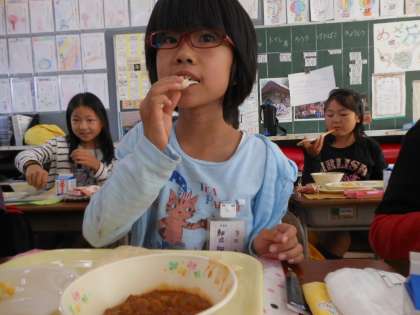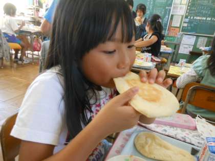 こちらの3年生・女子も、ナンにカレーをつけて、がぶりと食べていました。