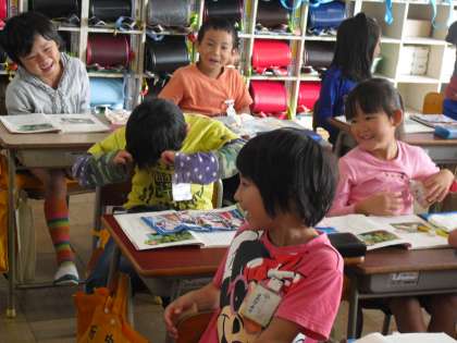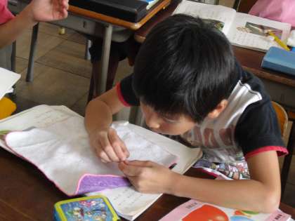 まめは、ふさと「へそ」でつながっていて、栄養をもらって大きくなると書いてありました。あずきと大豆を持ってきてくれた子がいて、みんなで本物のまめの「へそ」をじっくり観察しました。中には自分のへそと見比べる子も・・・。にんげんも、お母さんのおなかの中でへそからえいようをもらっていました。まめもいっしょなんだね。