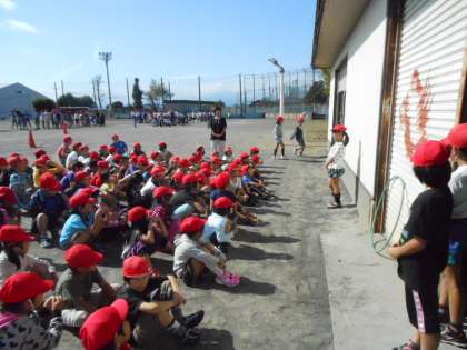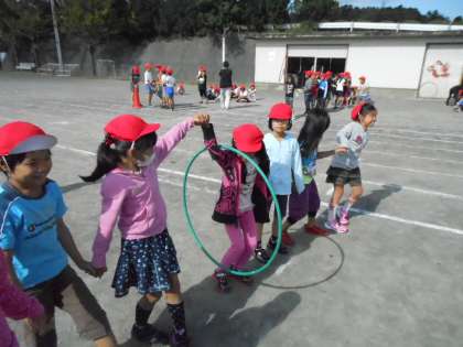 3年生は学年集会でフラフープリレーを行いました。手をつなぎフラフープをバトンの代わりにパスしていきました。思うようにパスできなかったり、逆にするっと通り越したりして楽しそうに行っていました。