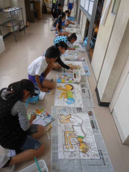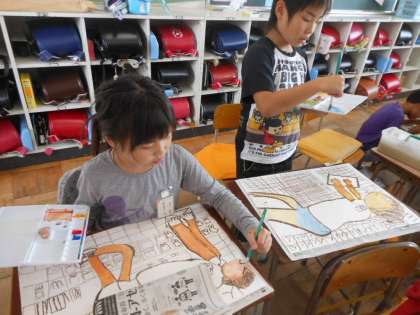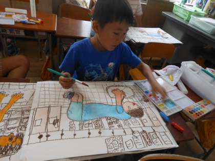 下絵が終わり、色づけにはいりました。一学期の学習を生かして、3色(赤・青・黄)のみで顔や腕の色を表現しました。それぞれ違った色具合で、とても満足そうに絵を描いていました。