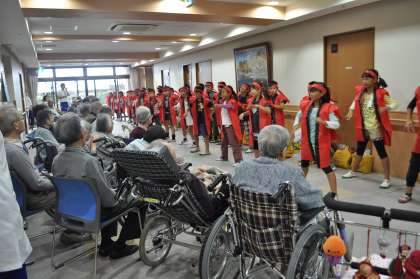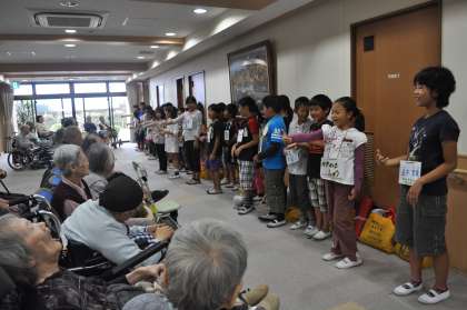 あしたかホームで交流会をしました。今まで練習してきた歌やソーラン節を披露しました。みんな少し緊張している様子でした。班で考えてきたプレゼントを入所者の方たちが喜んでもらってくれたので、子どもたちの笑顔が広がっていました。次回が今までよりも楽しみになりました。