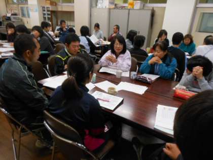生徒指導主任からのアンケート結果の読み取り方についての説明のあと、学年ごとに分かれて、個々のクラスの状態やそれにあった対応の仕方について話し合いました。