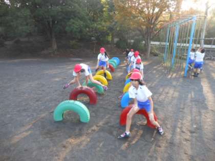 鉄棒やタイヤ跳びなど、手が冷たくなってきましたが、がんばっています。