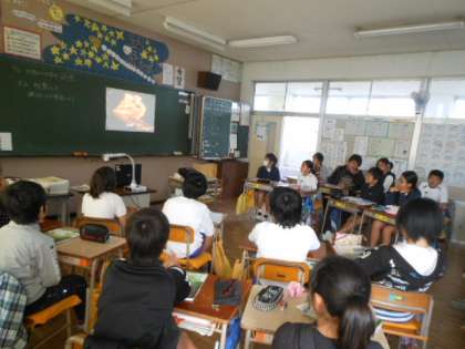 土地の形を変化させるものとして、火山と地震について調べました。今日は調べたことを大きな画像にして発表したり、火山の噴火の様子をVTRで紹介したりしました。