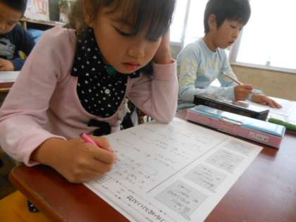 先生の説明を聞いて、問題を解きはじめました。回答を聞いて自分で丸付けをして、確認をしました。