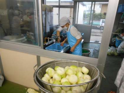 シチューに煮込むタマネギやサラダに使うキャベツが大量に下処理されていました。