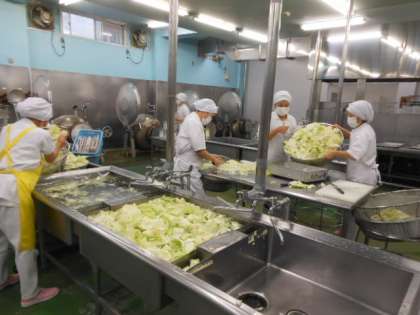 朝の給食室、今日もおいしい給食を食べてもらえるように、準備が始まりました。