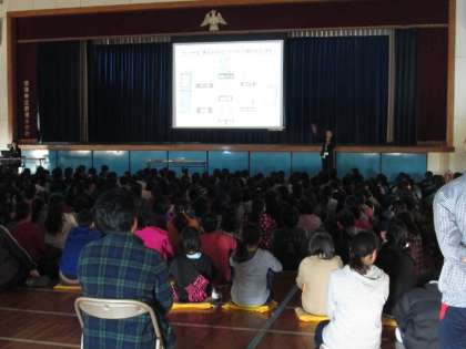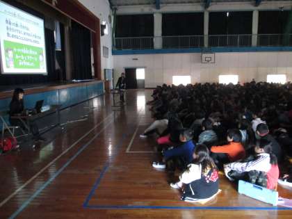携帯電話会社の方を招いて、「ケータイ安全教室」を行いました。メールやインターネットの安全な利用の仕方を、分かりやすいスライドやVTRで学びました。