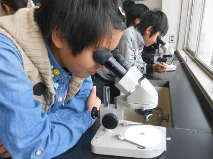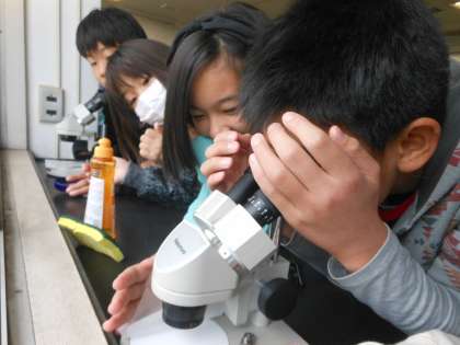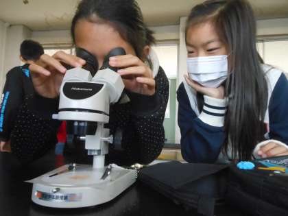 火山灰を双眼実態顕微鏡で観察しました。流れる水のはたらきでできた地層の土とは、形や含まれるものがちがっています。透明なガラスのような粒もあり、はっきり見えた時には驚きの声があがりました。