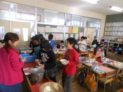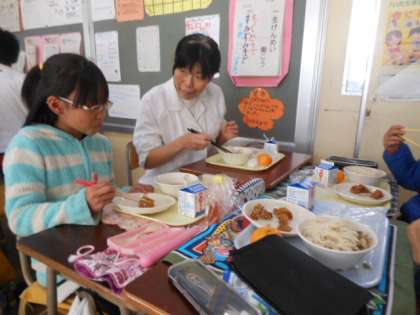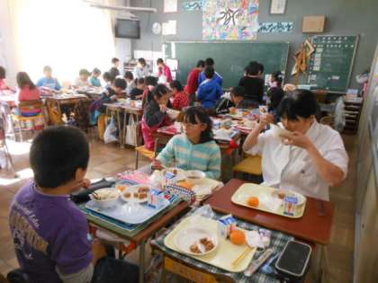 会食をしている班の子どもたちと、給食についての話をしていました。