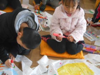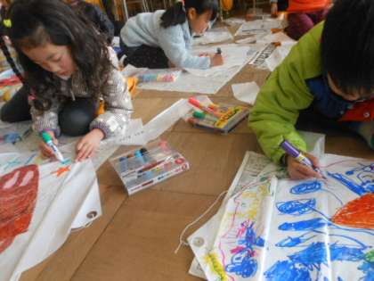 お正月のあそびといえば、たこあげです。真っ白の大きなたこに、思い思いの絵をかいて、自分だけのオリジナルたこを作りました。